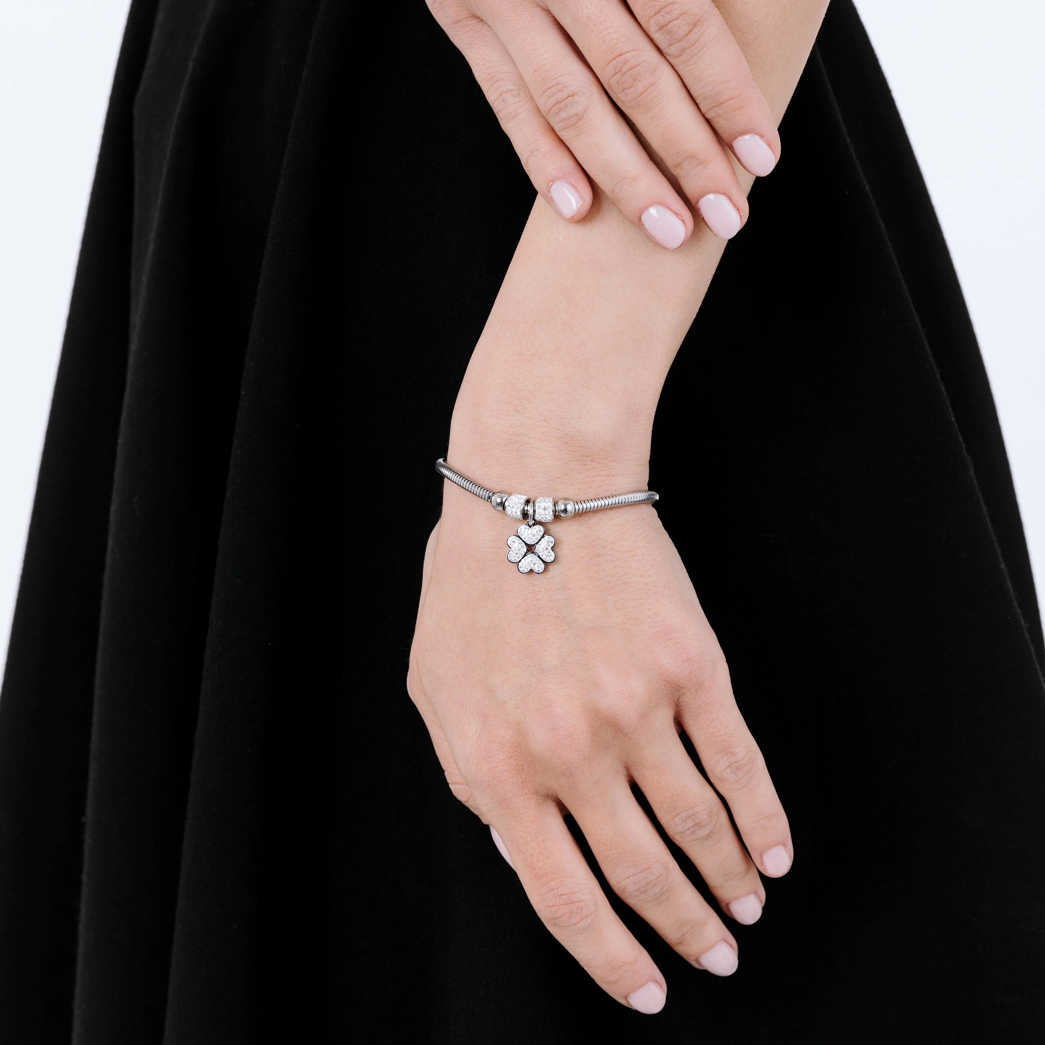 BRACCIALE DONNA IN ACCIAIO CON QUADRIFOGLIO E CRISTALLI BIANCHI—