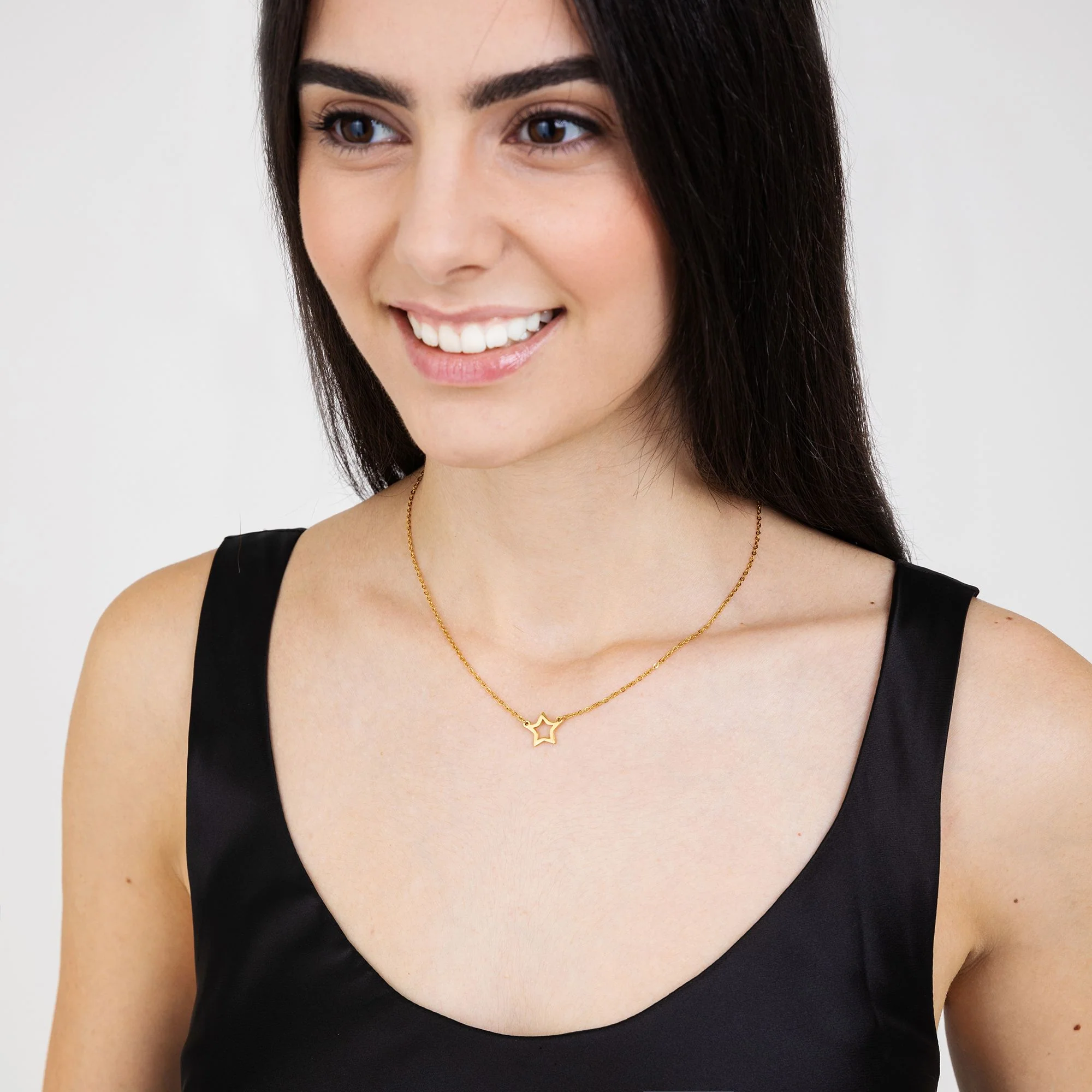 Collana in acciaio dorato con stella. Lunghezza: 40 + 5 cm.