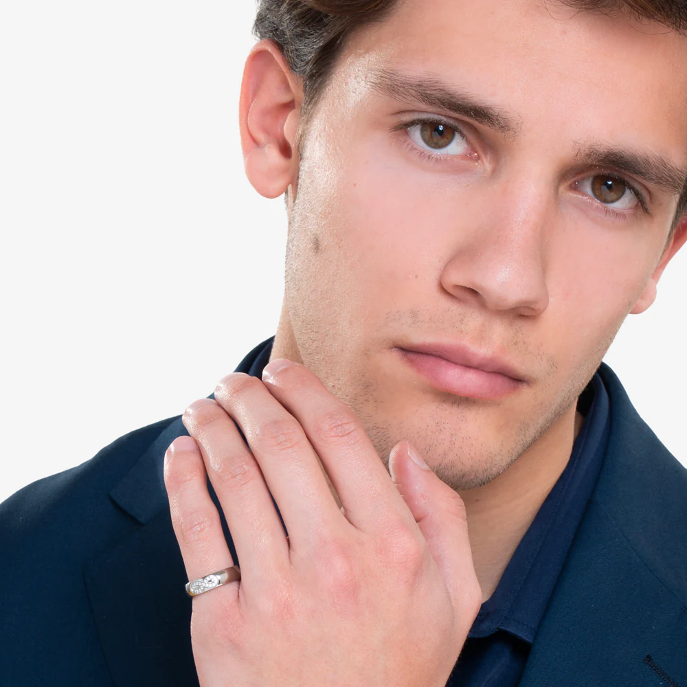 Fedina donna e uomo in acciaio con infinito con cristalli bianchi.